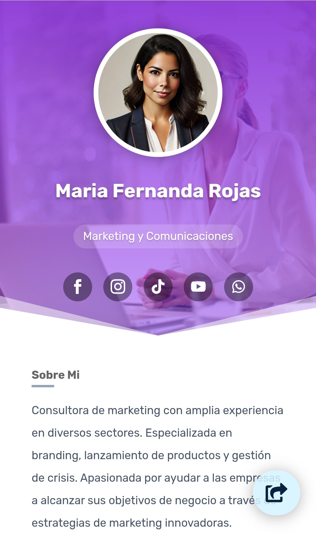 - Redes sociales: Puedes publicar tu tarjeta digital en perfiles de redes sociales o compartirla en mensajes directos. Esto facilita que colegas, clientes o contactos vean tu información sin necesidad de salir de la plataforma, manteniendo un enfoque moderno y práctico en la interacción profesional.